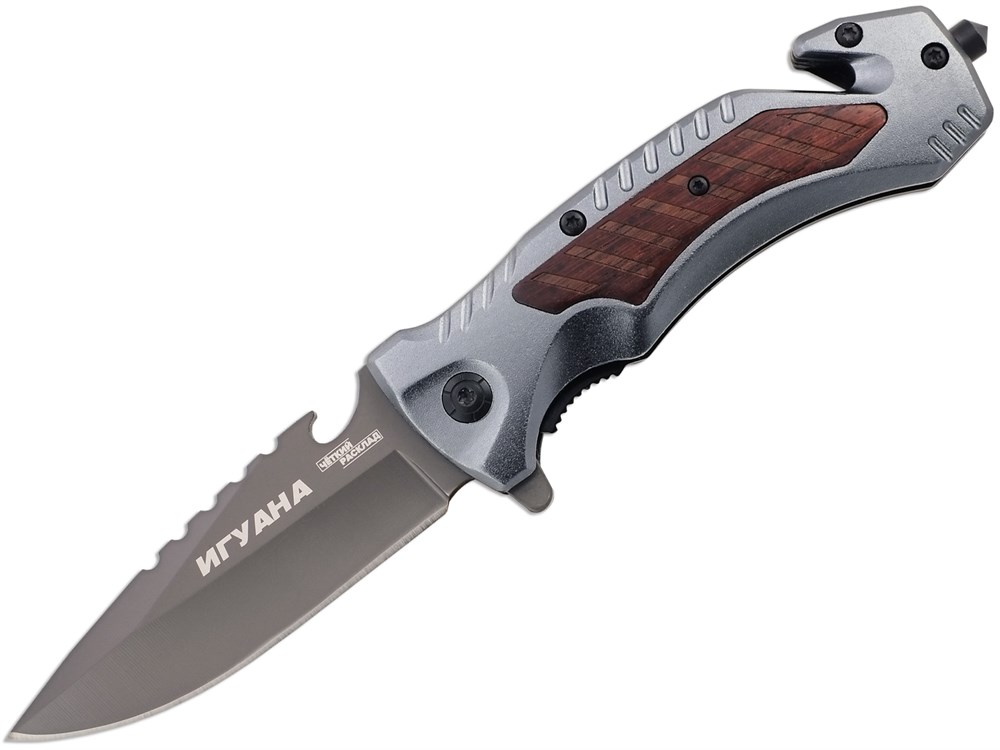 Яркий харизматичный нож «Игуана» от российского производителя «Ножемир». Он отличается превосходной остротой клинка и высокими показателями тактико-технических характеристик. Клинок drop point изготовлен из гибкой прочной нержавеющей стали и дополнен рельефным участком на обухе и крюком в верхней части пяты. Стильная ортопедическая рукоять покрыта накладками из полимерного материала и древесины. В задней части спинки предусмотрен стропорез, а в центре тыльника имеется стеклобой. В рабочем положении лезвие надежно без расшатывания и люфта удерживает лайнер замка liner lock.