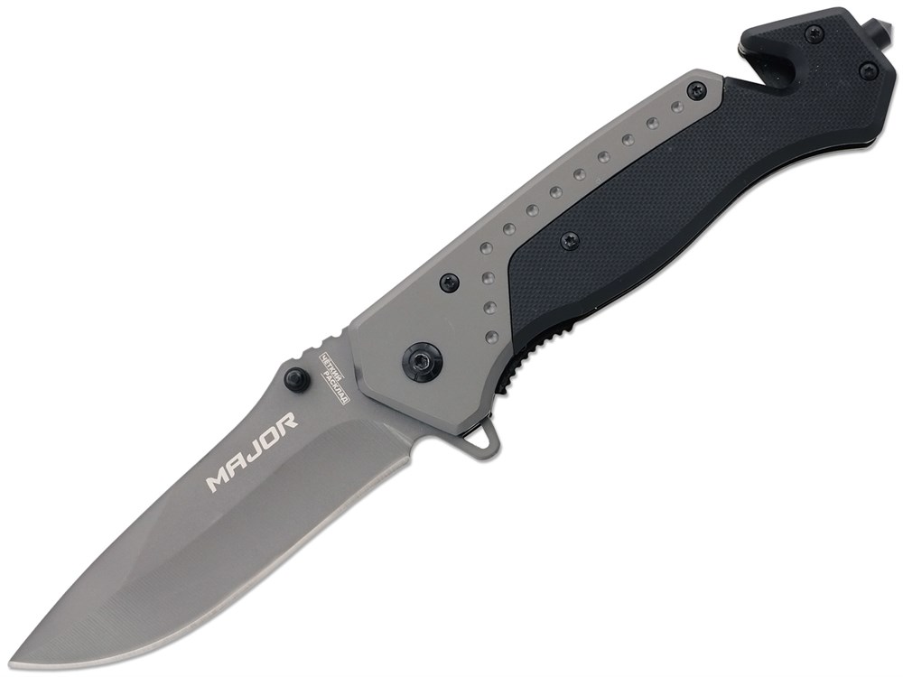 Крупный складной тактический нож Major от ведущего производителя российских ножей «Ножемир». Широкое массивное лезвие этой модели изготовлено из легированной стали 440, устойчивой к воздействию коррозии и обладающей хорошими показателями упругости и твердости по Роквеллу. Замок liner lock надежно удерживает его в рабочем положении, не допуская люфта и расшатывания. Снимается с фиксации он автоматически с помощью флиппера-плавника, расположенного в нижней части рикассо клинка. Удобная хваткая рукоять отделана составными накладками из металла и стеклотекстолита G-10. В ее тыльной части размещены стропорез и стеклобой.