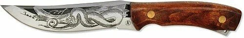 Роскошный нескладной нож, изготовленный в лучших дагестанских традициях. На его функциональный клинок со слегка приподнятым над линией обуха кончиком нанесена изысканная гравировка силуэта змеи. Изготовлен он из качественной нержавеющей стали, высокое содержание углерода в которой обеспечивает бритвенную остроту режущей кромке, а присутствие хрома – устойчивость к воздействию коррозии. К цельнометаллической основе присоединены накладки на рукоять, вырезанные из ореха. Их нижняя часть оснащена подпальцевыми дугами, обеспечивающими прочное расположение ножа в ладони. «Змей 2» укомплектован роскошными ножнами из натуральной кожи с тиснением, дублирующим гравировку на клинке.